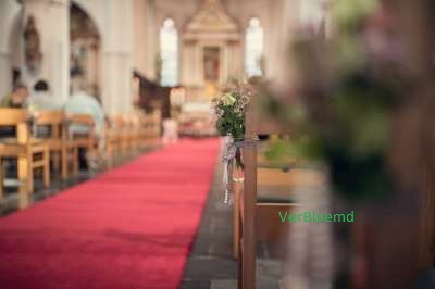 Dienen de de bloemen van de bruidsmeisjes en de aankleding van de kerk of feestruimte daar bij aan te sluiten.